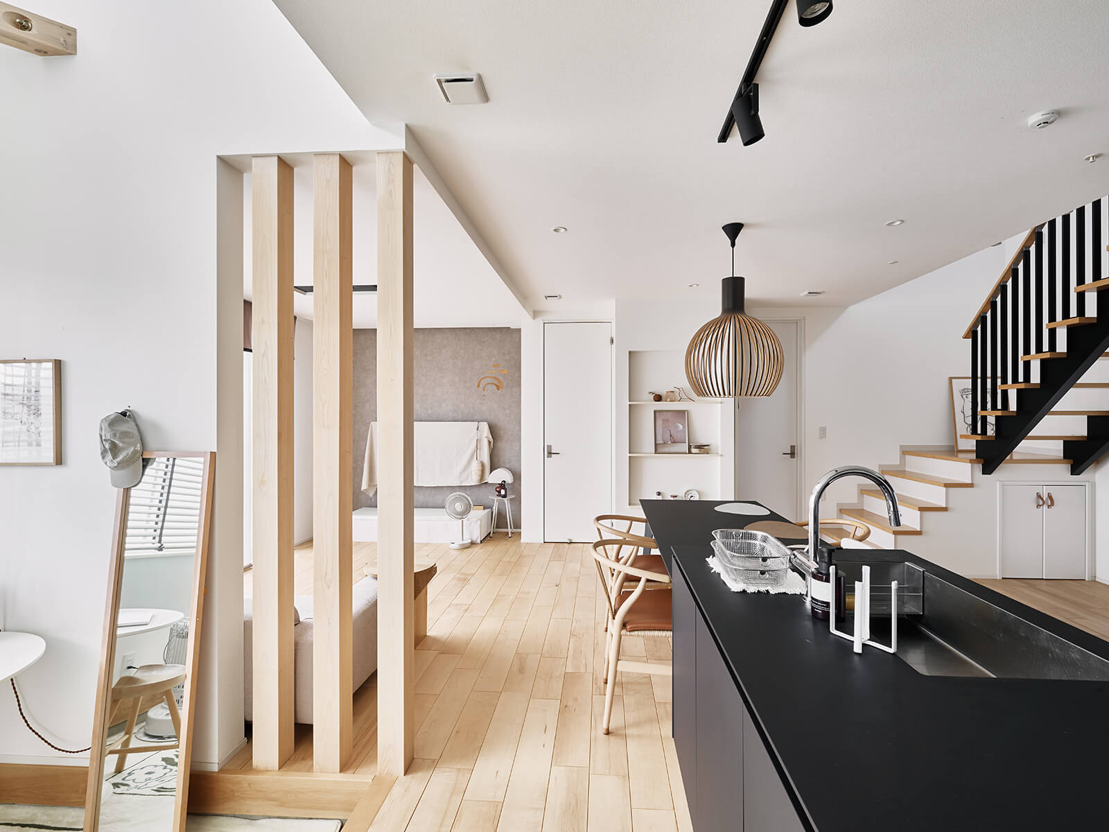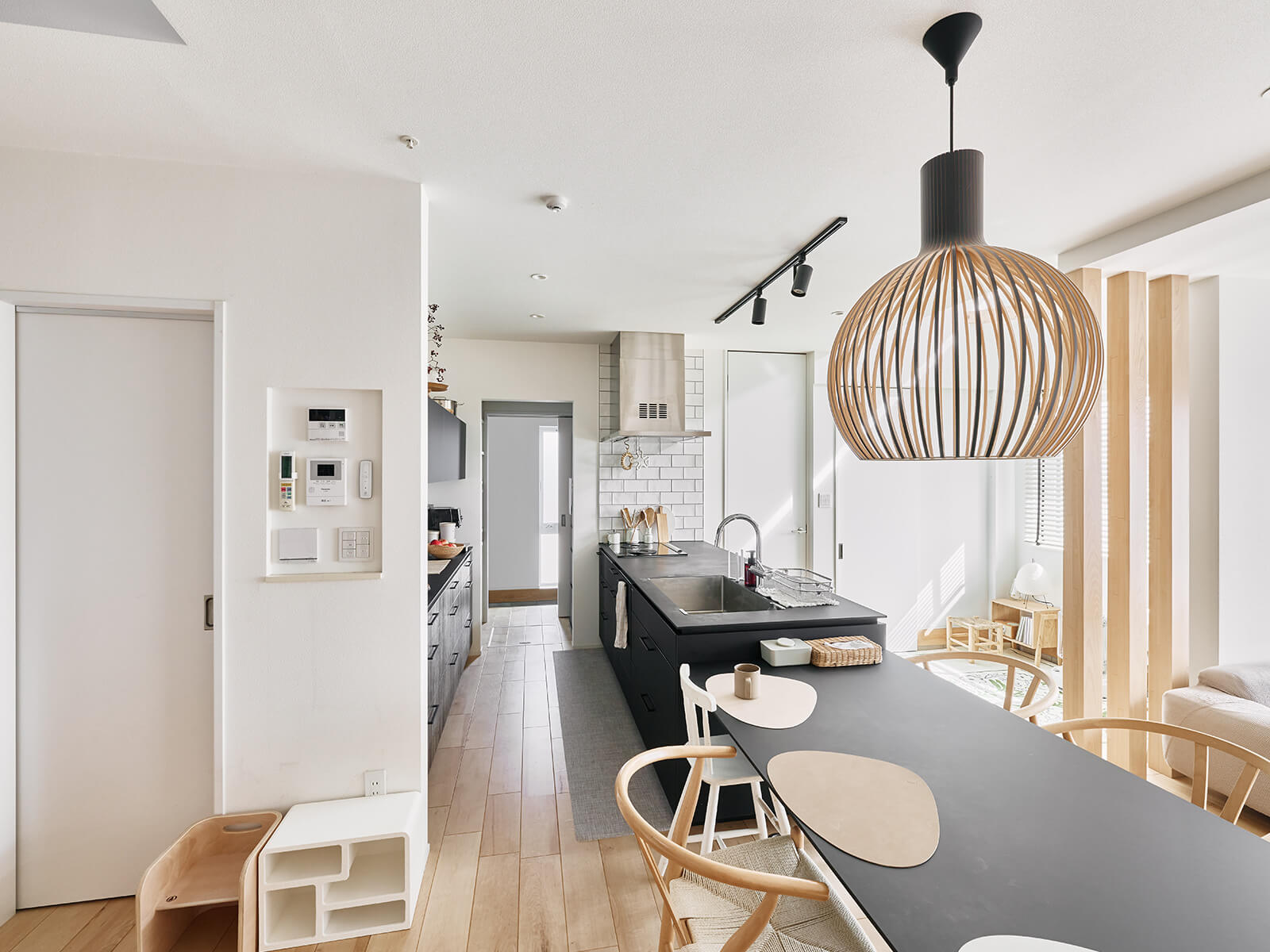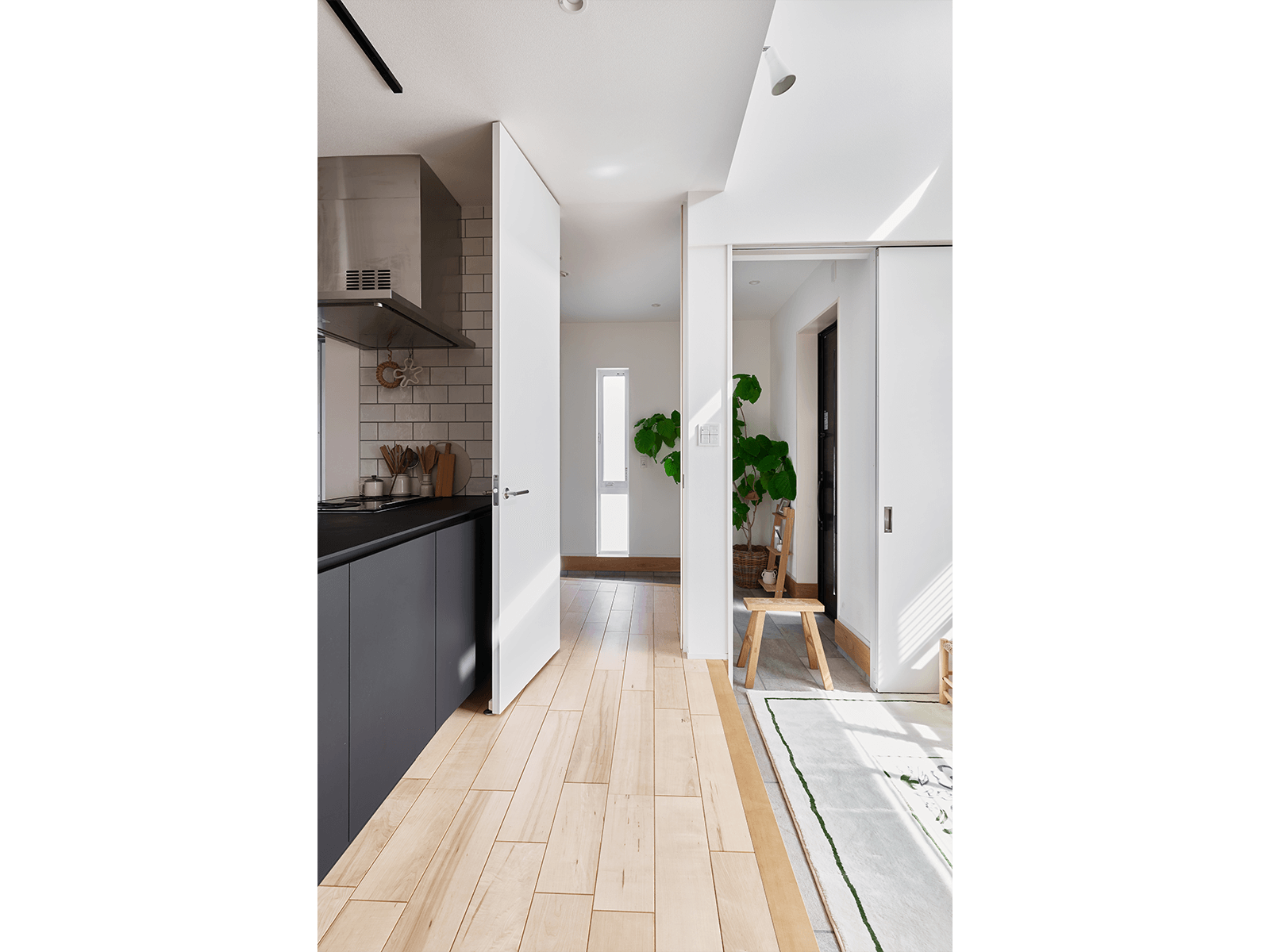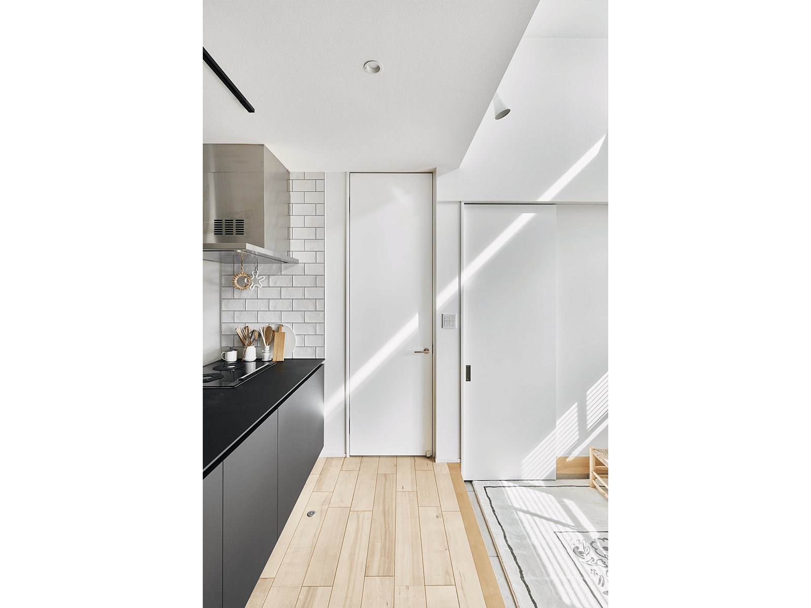 存在感のあるブラックのキッチンに組み合わせたのは、無垢材の明るいメープルの床と白い壁。ドアは壁に溶け込むように白を選びデザインも極力シンプルに。