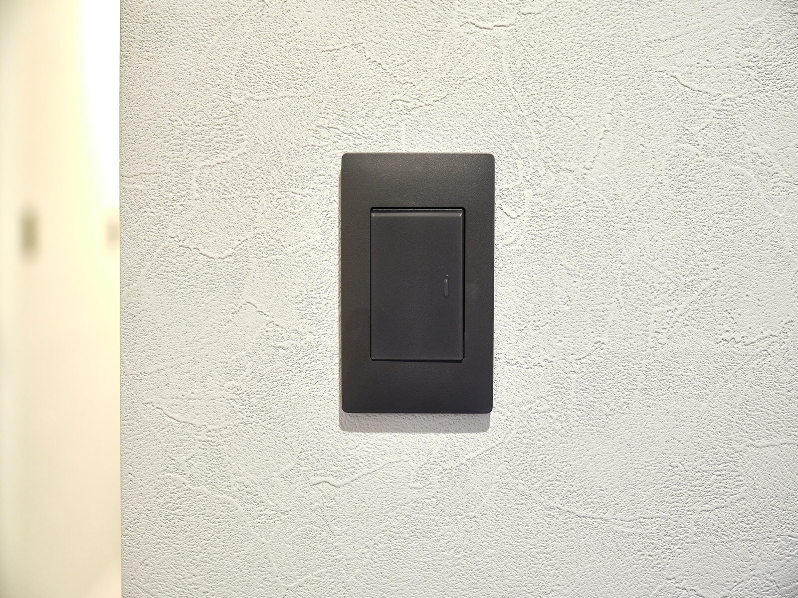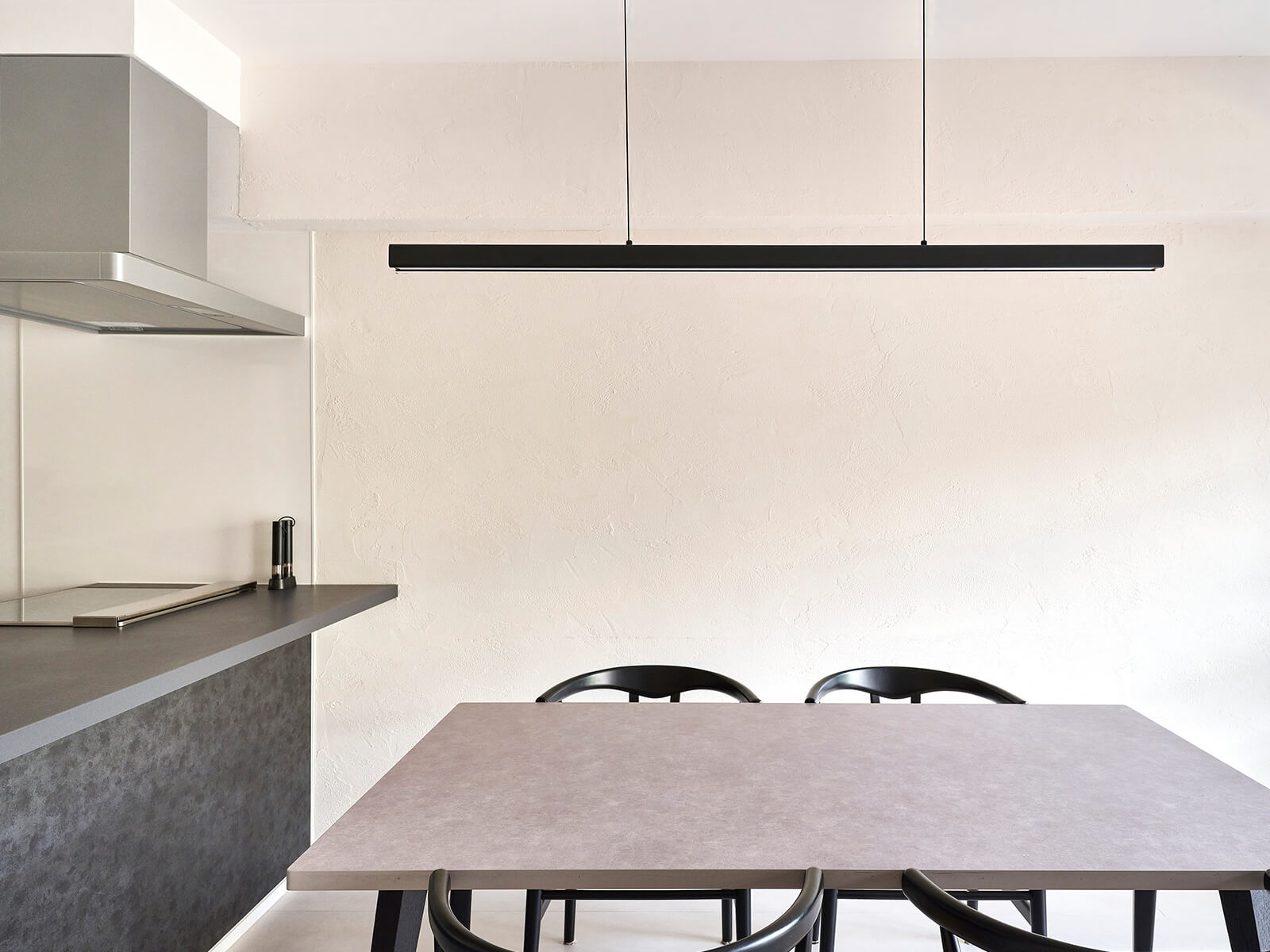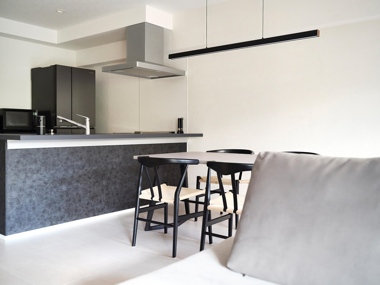 淡いグレーのソファにリモコンほか小物を収納できるセラミックのローテーブル。メラミン素材のダイニングテーブルにブラックのペーパーコードの椅子。家具からスイッチプレートに幅木まで、細部にこだわりスタイリッシュな世界観をつくり上げた。