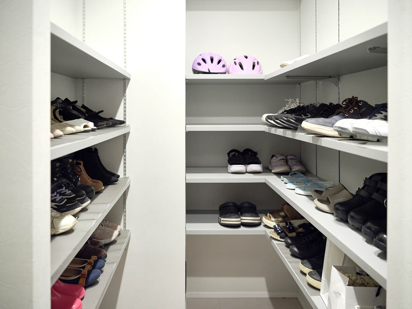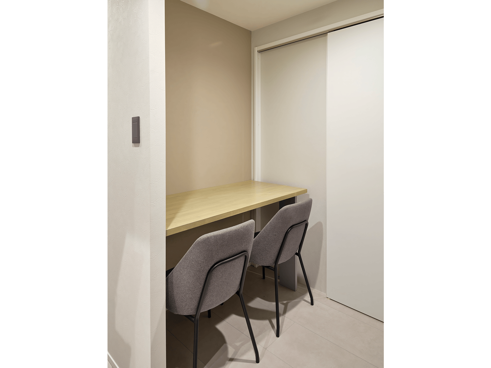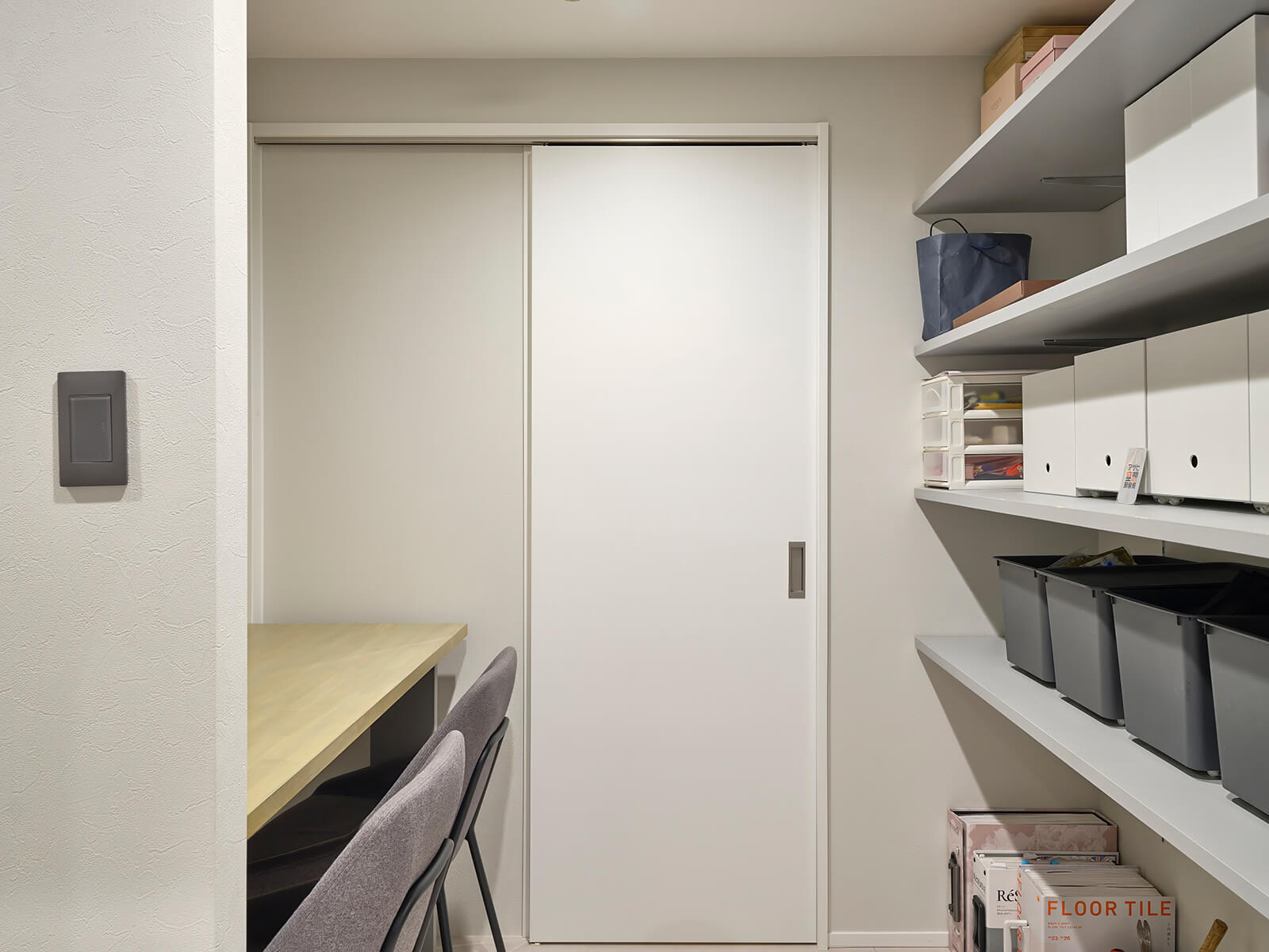 マンションリノベの限られたスペースを有効活用し、シューズクローゼットを含む大容量収納とワークスペースの確保を叶えた。