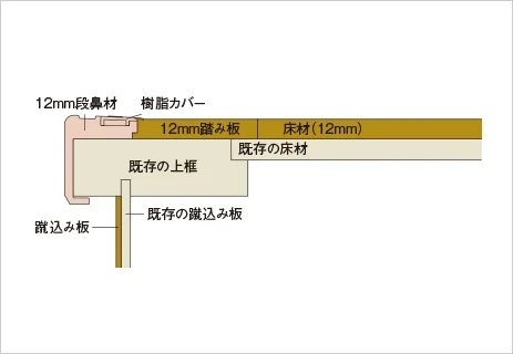 12mm厚の踏み板と専用段鼻材もご用意。上階部分の納め方に合わせて柔軟な対応が可能です。