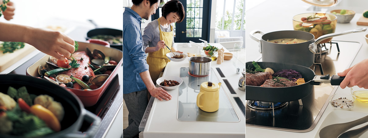 お鍋やフライパンを同時に使えるので、ムダな動きなしに調理ができます。手前のスペースを使って下ごしらえや盛り付けができます。種類はIHやガスなど暮らしに合わせて選べる4種類をご用意。