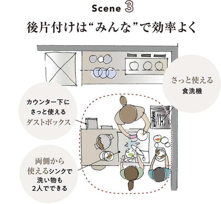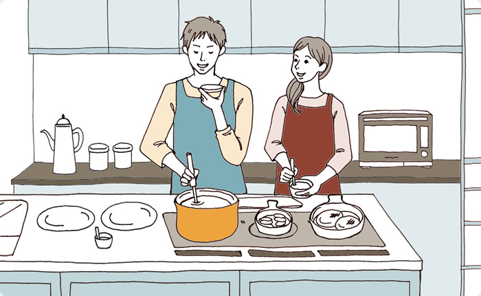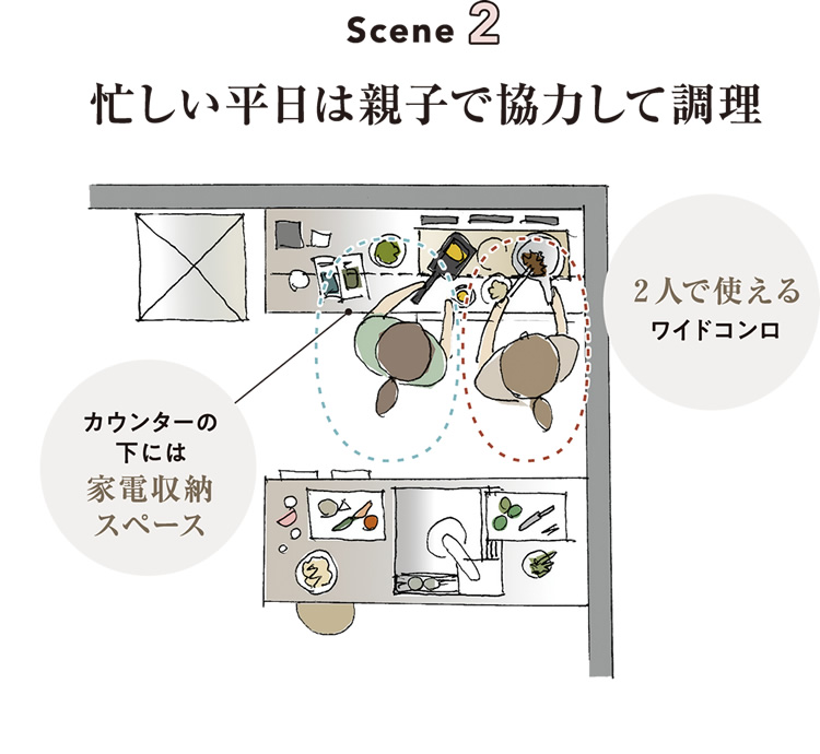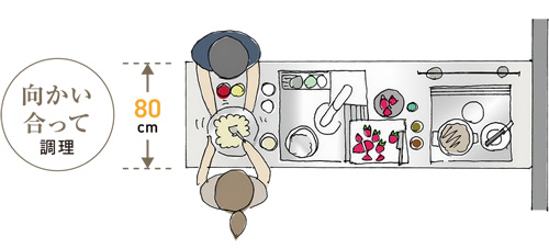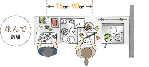 ※当社モニター調査結果より(N8組) 8組のご夫婦の社外モニター対象。当社製キッチンにて、2人で同時調理をしたときの、調理のしやすさについて調査を実施。ひとつのキッチンで2人同時に調理作業時、作業動作として必要な物理的な距離及び心理的に「ちょうど良いと感じる距離感」について確認。アンケート結果から、物理的な作業領域を確保でき、かつ、心理的にちょうどよいと感じる距離感は、目安として約75cm~90cm程度という結果を確認。横壁面キッチンに設置されたコンロの物理的な距離条件に当てはめると、従来の一般的な壁際にある3口コンロで、2人同時に調理作業時の距離は60cm程度、フラットワイドコンロシリーズでは両端左右の加熱部での調理作業時75cm程度の距離を確保。