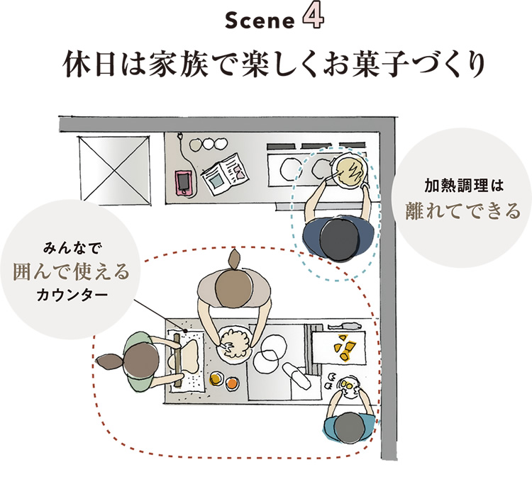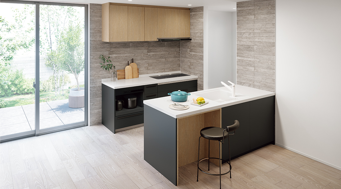 手前のスペースを使って下ごしらえや盛り付けができます。種類はIHやガスなど暮らしに合わせて選べる4種類をご用意。