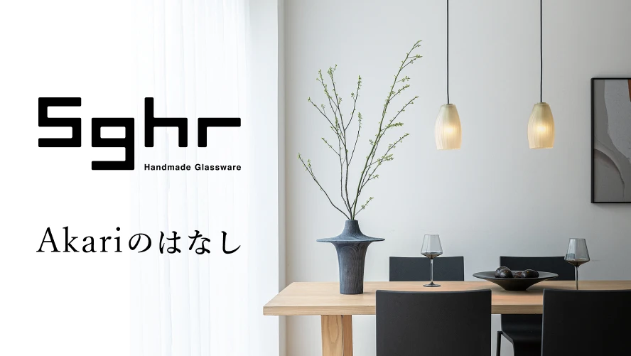 菅原工芸硝子とコラボしたハンドメイドガラス。不規則で柔らかな形状があたたかみのある輝きを放つ。