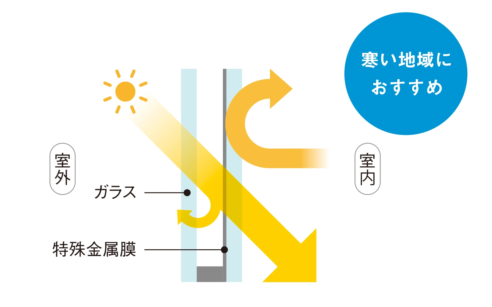室内側のガラスをLow-E膜でコーティングしており、断熱効果を高めながら、日射熱を取り込みやすく。