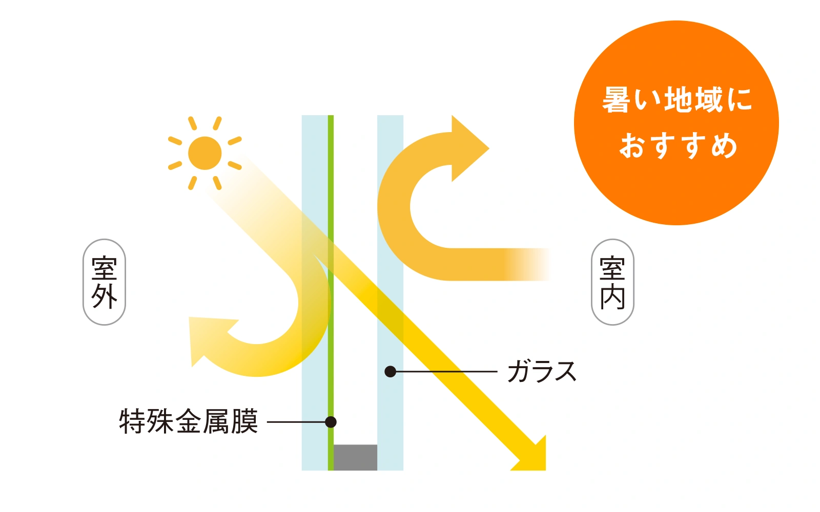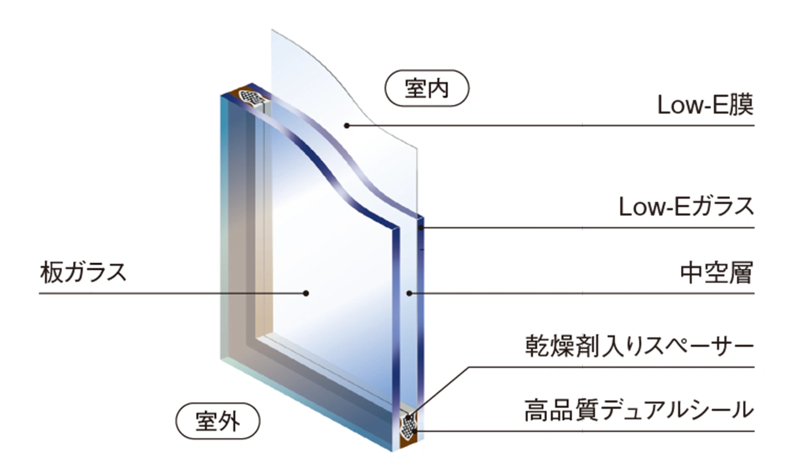 室内側のガラスをLow-E膜でコーティングしており、断熱効果を高めながら、日射熱を軽減。