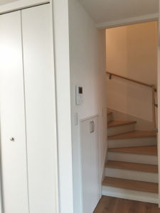 階段は、既存のものを利用し、新しく収納建具を設置。家族みんなが使い易い場所へ インターホンを移動しました。