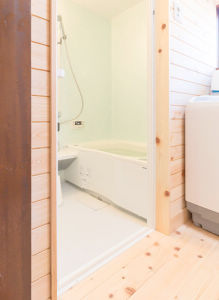 浴室と同時に、洗面脱衣所の床や壁も群馬県産のヒノキの無垢材でリフォーム。自然と温泉を愛するK様にとって、お風呂上がりも心地よく過ごせる、あたたかみのある空間になりました。