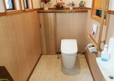 小便器をなくしたので、広々と使えるトイレ空間になりました。広くなったので空間を活用して飾り棚と収納も一緒に造っています。壁・床も貼り替え、床はPanasonicのリフォームフロアー珊瑚石柄です。水まわりなので掃除のしやすい床材を採用しました。
