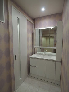 廊下の垂れ壁を撤去し、洗面コーナーに向かう通路と一体化させ、明るくした。