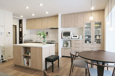 壁一面にスッキリ納まったキッチンとカップボード。キッチン前にはインテリアカウンターを付けて、おしゃれな調味料置きに。ご友人を招いて、将来的にはアイランドカウンターでカフェバーのようなことができたら、と奥様。