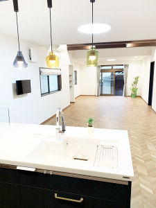 ご主人様お気に入りのヘリンボーン柄。アーキスペックフロアーWお洒落なリビングダイニングですね!