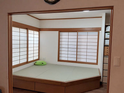 『畳が丘』を設置。たっぷり入る収納には、ご家族の思い出の品、お子様の成長の記録を収納。南西角で、窓を開けると風通しが良く、冬は日が入り暖かく気持ちの良い空間になりました。