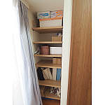 梁下もサイズピッタリの可動棚を設置しました。日用品のストック収納に重宝します。