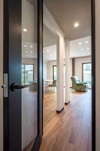 クラフトレーベルの硝子戸がLDKへのゲートとして設置。お部屋に入る前からワクワク感が広がります。