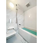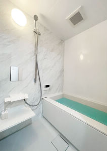 石目調のアクセントパネルがおしゃれな、清掃性抜群のお風呂が完成しました。