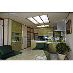奥様がお好きなグリーンを基調にまとめたダイニングキッチン。まず、キッチンの色を決めてから、それに合う床や内装ドアをカラーコーディネイトしました。