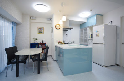 白いLDKに映えるブルー系のキッチンは、ショウルームで一目惚れされたもの。 パナソニックキッチン「リビングステーション」は、柱の形に合わせたオーダーメイドです。
