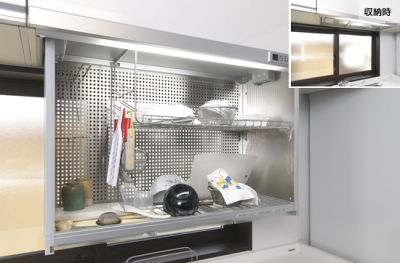 スイッチを押せば手元まで下りてくる水切り棚「電動昇降ユニット」。洗った食器を隠せるので、来客の目も気になりません。場所をとる水切りカゴも必要なくなったので、キッチンがすっきりしたと大満足。