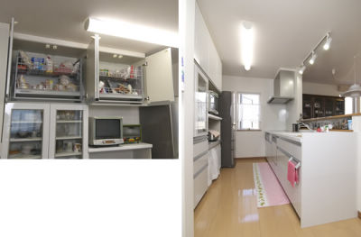 IHや食器洗い乾燥機を採用した、奥様こだわりのシステムキッチン「リビングステーション」。上部の収納棚は、取っ手を持ってラクに手元まで下ろせるので大助かり。踏み台が必要なくなったと喜んでおられます。