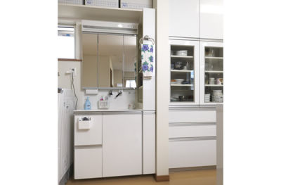 キッチンや洗濯機とカラーディネイトした、ホワイトの洗面ドレッシング「ウツクシーズ」。水栓のホースが伸びるので、お掃除もラクラク。鏡の裏側や引き出しにたっぷり収納でき、モノが出しっ放しになることがありません。