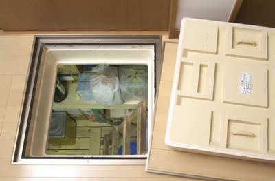 1階のキッチンや廊下の床下にあるデッドスペースを活用して、床下収納を設置。階段で降りていく大きな収納に、ストック品などを保管されています。床下がひんやりしていて、生鮮品が長持ちする気がする、とお母様。