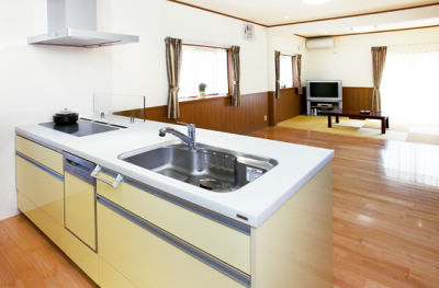 細かく区切られて狭かった居間とキッチンを広びろしたLDKにリフォーム。キッチン「リビングステーション」には、トリプルワイドIHや食器洗い乾燥機を採用して、後片付けも掃除もグンとラクに。奥の庭に面した場所は畳を敷いて、くつろぎスペースを設けました。