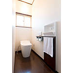 便座が大きくて座ったときに安定感がある全自動おそうじトイレ 「アラウーノ」。タンクレスになって見た目もすっきり。広々した空間に感じます。美しい木目柄の床「ベリティス」で高級感あふれるトイレに生まれ変わりました。
