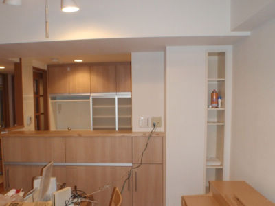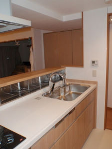 築12年の分譲マンションを中古購入し、今回水廻りの交換と全室のクロス貼替をしました。キッチンは明るくリビングが見渡せるようにし、収納棚もキッチンと同じシリーズで揃えています。また、設備機器は最新のものを選び、特にユニットバス