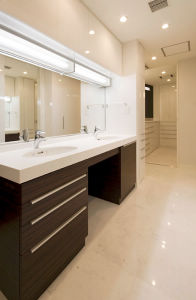 共通の知り合いからの紹介で工事させて頂きました。非常に凝ったリフォーム工事で、特にアール(半円)の板張り壁には苦労しました。この壁は現場で大工さんが造るのではなく、家具屋さんにお願いしました。その工場で先に仮組し図面通りになっているかまた、アールの扉が上手に稼働するか等を確かめたうえで細かく分解し、現場で組み立てると言う作業でした。その他にも製作家具が沢山あり、家具屋さんとの打合せに多くの時間を掛けました。その仕上りにはお客様も大変満足されていました。それから、当初お客様は、仕上りばかりを考えておられて断熱とか耐震とかにはあまり考えておられなかったのを、こちらから提案させて頂き採用しました。
