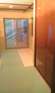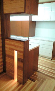 天井・壁・床 全てに無垢材を使用し木の持つリラクゼーション効果とあたたかさを満喫していただき、その中で、キッチン~ダイニング~脱衣室・寝室の導線にも気を付け出入口も車いすが十分使える寸法で提案しました。また限られた台所スペースも天井高を最大限に上げ化粧梁を見せることで空間に奥行を持たせ、壁埋め込み照明で遊び心も取り入れました。寝室につながる廊下の床には畳の縁のない琉球畳を使い、素足で歩いてもあたたかく転んでも安全なように配慮しました。また、この畳の廊下にキュビオスとクローゼットを配置することで廊下を納戸代わりに使っていただけるようにしました。
