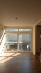 新しくなったリビングの窓。追買い易さと、断熱性能を兼ね、今回はFIX窓と引違い戸の組み合わせとなりました。