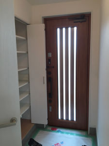 以前の玄関ドア・風除室を撤去し、現在の断熱ドアに交換。玄関の涼しさ・温かさを逃がさない様になりました。