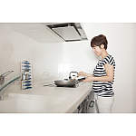 手前のスペースが広く、フライパンを置いても柄が飛び出てひっかかることがない点もお気に入り。コンロやレンジフードもサッとふけば汚れが取れるので、「キッチンが汚れないんです(笑)いつもキレイでうれしい!」。