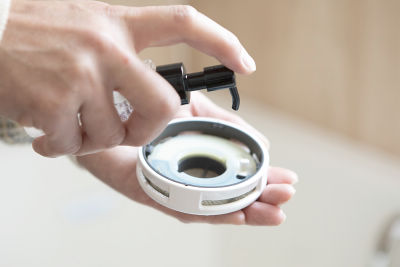 専用ケースに「美泡湯オイル」を2回プッシュし、浴槽にセットするだけ。S様邸では1日おきにラベンダーのオイルを楽しんでおられます。