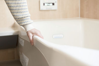 S様はいつも浴槽の縁を掴んで出入りされていますが、これがとても握りやすいそうです。“浴槽の形状も昔のような直線ではなく、人が使いやすいようにいろいろ工夫されていると感じます。お風呂も進化しているんですね(笑)”。