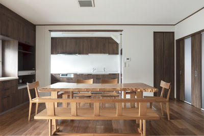 大きなケヤキのダイニングテーブルを囲む木の風合いにあふれた住まい。