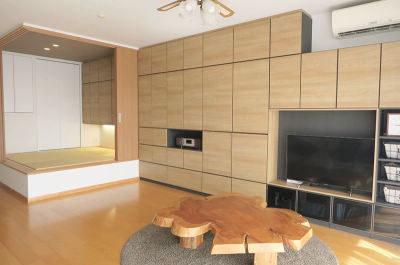 個室を子供室にするため、リビングに畳小上がりの和室空間を作って、ご夫妻の寝室に。壁一面のキュビオスで、LDKの収納力も充実しスッキリとした空間に。取合収納・既存のリビング収納・キッチン背面奥も、使い勝手良く改装しました。