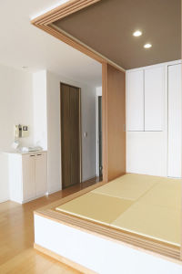お布団のサイズを考慮して極力圧迫感が出ないよう計画した畳小上がり空間。L字に開くので普段は開放的に。取合収納は、お布団とご主人様のお洋服収納を計画。