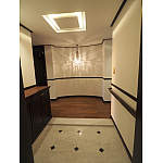 間接照明とシャンデリアに変更し、華やぐ雰囲気に。玄関収納の天板はウォルナットに変更し、床の統一感を演出。