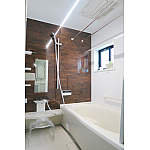 シックなアクセントパネルで奥行き感ができ、同じサイズながらも浴槽の向きを変えることで、より広く感じるように。ペアガラスの引違い窓で気密性を上げ、より暖かくお手入れしやすい浴室に。