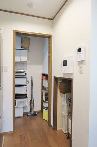 旧ユーティリティは、パントリーを兼ねたちょっとした作業ができる奥様の隠れ家スペースに。収納される物をお伺いしながら棚を造作したので、物をスッキリ納められるようになりました。