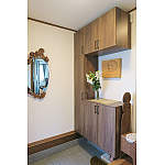 コの字収納にすることで、トール収納を入れても圧迫感なく。ウォールナット柄が、お母さまの彫刻作品とも調和して、風格ある玄関になりました。