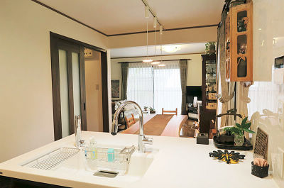 間仕切り壁をとることで、ダイニング・リビングと視線がつながり会話が増えるように。キッチン側からは、リビングの向こうのお庭まで見渡せ、開放的なLDKへ。隙間があったリビング片引戸もお取替え。