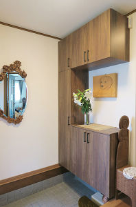 コの字収納にすることで、トール収納を入れても圧迫感なく。ウォールナット柄が、お母さまの彫刻作品とも調和して、風格ある玄関になりました。