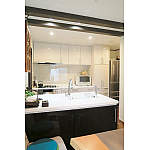 壁を抜いてⅡ列型対面キッチンに。コンロ側とシンク側のキッチンの扉色を変えることでメリハリができ、引き締まった空間になりました。照明はダクトレールで大人数の時も対応できるように。