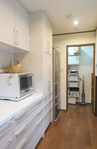 キッチンに充分な調理スペースとレンジ置き場を考慮したので、奥のパントリーまでの通路をゆったり確保。洗濯機を移動してできた奥のお部屋は、パントリー兼ちょっとした作業スペースに。