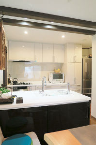 シンク側キッチンと同色の木目シートを貼った梁がアクセントに。キッチン本体の収納量がアップしたので、溢れていた物もスッキリ納まりました。お隣の視線が気になるキッチン窓は塞いでも、LDからの光で明るい空間に。