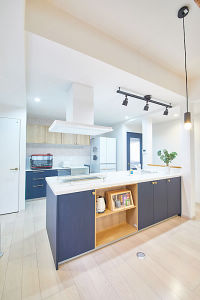 パナソニック・ラクシーナのカタログ表紙に一目惚れ。こんな空間にしたい!とパナソニックキッチンが中心で全体の空間が出来上がっていきました。すっきり見える空間ですが収納量もたっぷりあり、パントリーも配置しておりますので生活感を隠しながらも使い勝手の良いキッチンになりました。キッチンと合わせて入口の扉もコーディネート出来たので空間のまとまりもあり、部屋の真ん中辺りにあるキッチンで通常暗くなりがちですが清潔感のある明るいキッチンになりました。