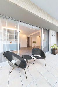 ●吊戸を撤去しフラット対面ペニンシュラ型キッチンにすることでLDとの一体感を持たせた。更に和室を取り込んで広々LDKに。●バルコニーにはエクステリアタイルを敷き詰めてLDKと一体的なアウトドアリビングに。